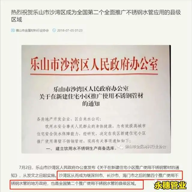 2018年7月2日,乐山市沙湾区人民政府办公室出台文件《关于在新建住宅小区推广使用不锈钢管材的通知》。