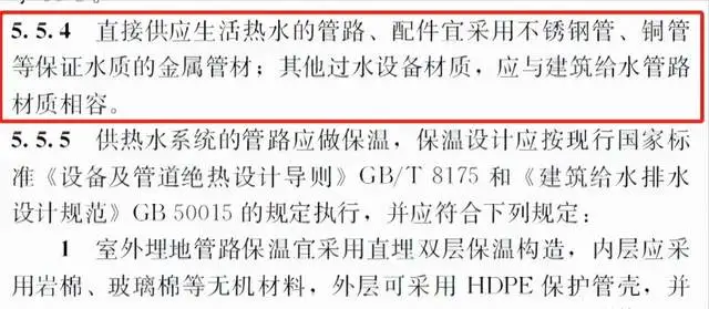 2018年7月10日,中国住房和城乡建设部发布国家标准《民用建筑太阳能热水系统应用技术标准》(编号为GB50364-2018),自2018年12月1日起实施。其中,第5.5.4条明确规定:“直接供应生活热水的管路、配件宜采用不锈钢管、铜管等保证水质的金属管材”。