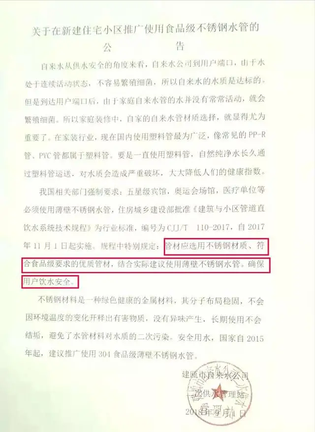 2018年9月1日,,介绍了福建省南平市辖建瓯市自来水公司二次供水管理站发布《关于在新建住宅小区推广使用食品级不锈钢水管的公告》不锈钢水管的卫生优势、标准规范,建议推广使用304食品级薄壁不锈钢水管。