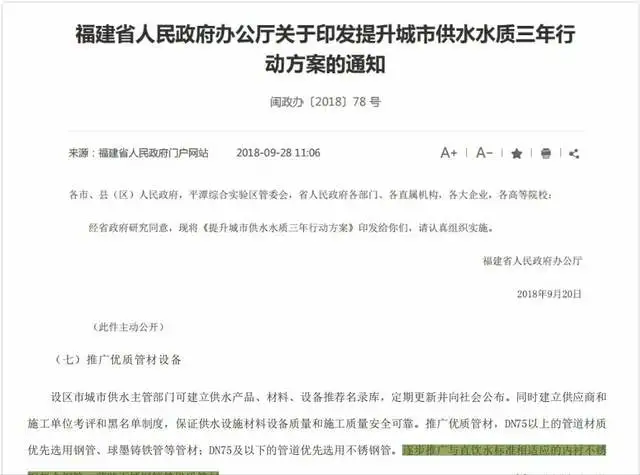 2018年9月20日,福建省人民政府办公厅印发《提升城市供水水质三年行动方案的通知》(闽政办〔2018〕78 号)。其中“第二、主要任务的(七)推广优质管材设备”有规定:推广优质管材,DN75以上的管道材质优先选用钢管、球墨铸铁管等管材;DN75及以下的管道优先选用不锈钢管。逐步推广与直饮水标准相适应的内衬不锈钢复合钢管、薄壁不锈钢管等优质管材。