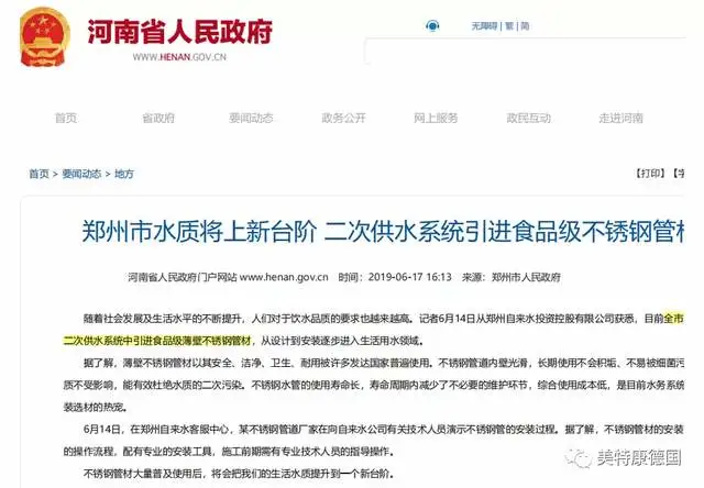 2019年6月17日,河南政府正式发布《郑州市水质将新台阶 二次供水系统引进食品级不锈钢管材》,大力推广使用优质不锈钢水管。
