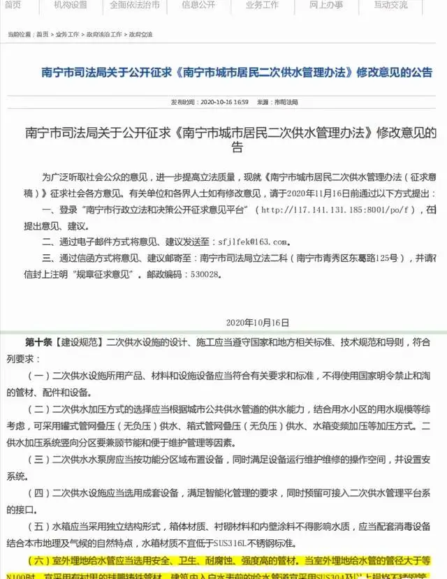 广西南宁出台的《南宁市二次供水设施及住宅供水一户一表技术导则(试行)》规定,建筑内入户水表前的给水管道宜采用SUS304及以上规格不锈钢管、钢塑复合压力管。管道的配件应采用与管材相应的材料。2020年10月月16日印发的《南宁市城市居民二次供水管理办法(征求意见稿)》第十条【建设规范】第六点也做了相同的规定,室外埋地给水管应当选用安全、卫生、耐腐蚀、强度高的管材。当室外埋地给水管的管径大于等于DN100时,宜采用有衬里的球墨铸铁管材。建筑内入户水表前的给水管道宜采用SUS304及以上规格不锈钢管、钢塑复合压力管。