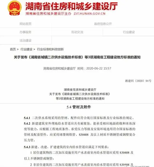 住房和城乡建设厅于2020年6月份发布的《湖南省城镇二次供水设施技术标准》(DBJ43/T353-2020),将在2020年11月1日正式实施,进一步推动全省范围内推广使用不锈钢水管,保障“最后一公里”的饮水安全。