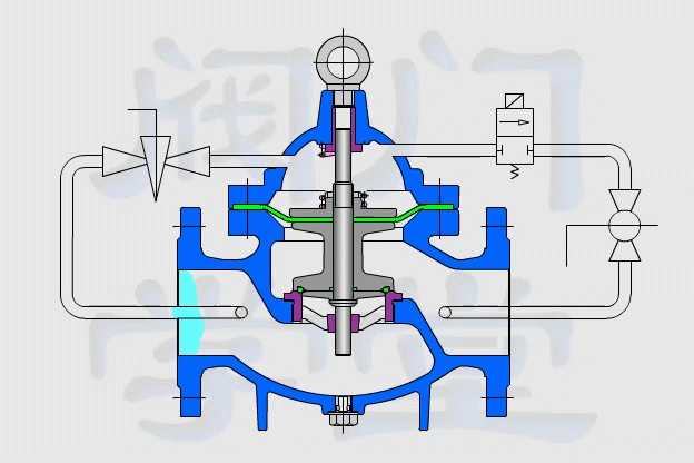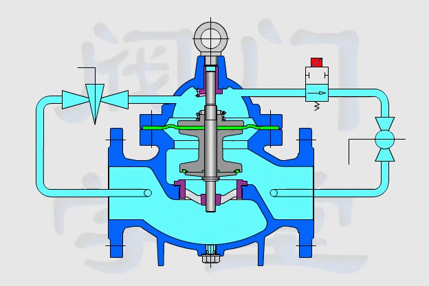 阀门进口端部分介质沿着导管。针阀。进入膜片上腔。当电磁阀线圈通电时,电磁阀开启。主阀膜片上腔介质沿着电磁阀,球阀流到出口,膜片上腔压力下降。在压力差作用下,介质压力推开主阀芯,主阀开启。开始供水。
