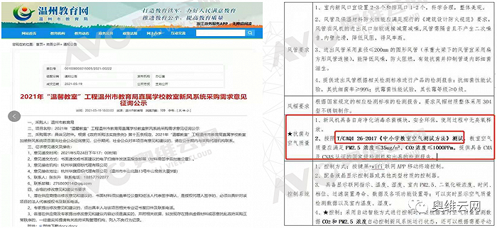 除住宅工程市场外,校园新风也为行业注入新的活力。源引自《“温馨教室”工程温州市教育局直属学校教室新风系统采购需求意见》(2021年5月19日)的文件中,要求:室内新风口宜设置2-3个,排风口1-2个,科学合理,整体美观。同时在抗菌与空气质量中要求:1.新风机.html'>风机具备自身净化消毒杀菌模块,安环环保,使用中无臭氧释放。2.按照T/CAQ1 26-2017《中小学教室空气测试方法》测试,教室空气质量要满足PM2.5<=35Ug/立方米、CO2浓度<=1000PPm,并且提供相应的国家机构出具的检测报告”。