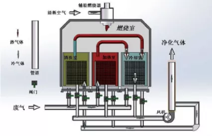 RTO把有机废气加热到760摄氏度以上,使废气中的VOCs在氧化分解成二氧化碳和水。氧化产生的高温气体流经特制的陶瓷蓄热体,使陶瓷体升温而“蓄热”,此“蓄热”用于预热后续进入的有机废气,从而节省废气升温的燃料消耗。陶瓷蓄热体应分成三个(含三个)以上的区或室,每个蓄热室依次经历蓄热-放热-清扫等程序,周而复始,连续工作。蓄热室“放热”后应立即引入部分已处理合格的洁净排气对该蓄热室进行清扫(以保证VOC去除率在99%以上),只有待清扫完成后才能进入“蓄热”程序。RTO蓄热式废气处理设备,运行费用省,有机废气的处理效率高的优点,适应废气浓度1000~10000mg/m³,分解效率:99%—99.5%。是目前最为经济可靠的达到50mg/m³严格的排放标准的VOCs治理技术,得到了广泛的应用。
