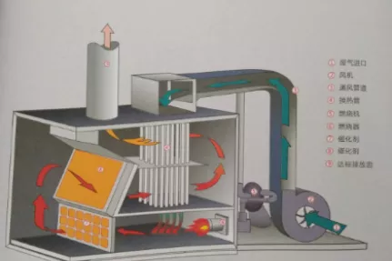 RCO蓄热式催化燃烧法作用原理是:结合蓄热式氧化及触媒氧化,在陶瓷蓄热体上部填充催化剂,借助催化剂使有机废气在相对较低的起燃温度(280-500℃)下氧化分解成CO2和H2RCO装置与RTO装置相类似,多采用床式设计,蓄热室底部填充陶瓷蓄热体,催化剂填充在陶瓷蓄热体与氧化室之间。 O,氧化产生的高温气体流经另一个蓄热室继续催化氧化反应放热,使陶瓷体升温而“蓄热”,此蓄热用于预热后续进入的有机废气。