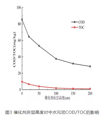 本研究通过调变催化剂床层高度探究中水污泥的高级氧化处理效果。由于催化剂为片状催化剂,填装在反应罐内,一方面催化剂其催化臭氧的作用,将臭氧转化为羟基自由基,提升臭氧的氧化电位,提高氧化效果。另一方面,催化剂也起到填料.html'>填料的作用,为气液相接触提供接触面积,增强氧化效果。因此,催化剂的加入量,也就是催化剂床层的高度,将影响着催化氧化的效果。