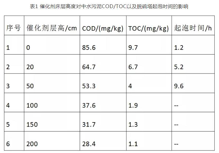 由图3和表1结果可知,当不添加催化剂时,中水污泥的COD和TOC分别为85.6 mg/kg和9.7 mg/kg,此时脱硫塔起泡时间为1.2 h。随着催化剂床层高度的提升,中水污泥的COD和TOC逐渐降低,脱硫塔起泡时间逐渐延长,单纯经过臭氧处理的中水污泥的COD和TOC指标变化不大,可基本认为单纯的臭氧对降解中水污泥中的有机物不起作用。当催化剂床层高度为100 cm时,中水污泥的COD和TOC下降至37.6 mg/kg 和1.9 mg/kg。继续增加催化剂高度至200 cm,虽然中水污泥的COD和TOC仍保持下降趋势,但下降速度明显放缓,仅降至28.4 mg/kg和1.1 mg/kg。增加催化剂床层高度,即增加催化剂量可以提高反应过程中羟基自由基数量,从而增大有机物与羟基自由基的有效接触,强化提升氧化处理效果。但一味地增加催化剂床层高度无法完全降解污泥中的顽固性有机物,并会提高运行成本。本研究的目的在于中水污泥回用于脱硫系统不发生起泡,由表1可以看出中水污泥的COD和TOC为37.6 mg/kg和1.9 mg/kg时,起泡现象消失。因此,催化剂床层高度设置为100 cm即可满足此要求。
