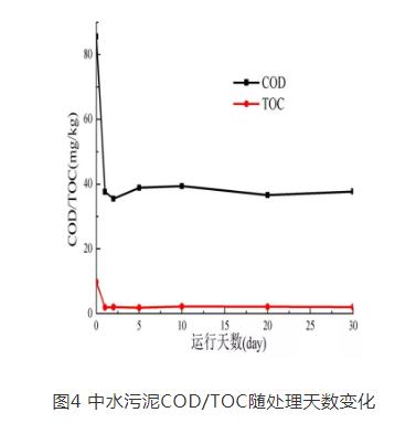 催化剂使用寿命是臭氧催化氧化工艺保持高率的关键。若催化剂使用寿命较短,则会缩短工艺运行周期,并且失活后的催化剂作为固体废弃物,造成二次污染。为此,本研究考察了在催化剂床层高度100 cm、中水污泥停留时间2 h工况下,中水污泥的COD和TOC随运行天数的变化规律。如图4所示,在连续运行30天过程中,COD和TOC去除效果保持稳定,其中COD始终在35~40 mg/kg,TOC维持在1.8~2.2 mg/kg,表明本工艺采用的催化剂具有优异的催化稳定性。同时,本研究采用高温煅烧制备的复合氧化物催化剂具有优异的机械强度和稳定性,能够保证催化剂不会在使用过程中因磨损而发生机械损失。此外,本工艺只需加入催化剂和臭氧,不需要对中水污泥进行预处理,也不依赖酸碱的使用,不仅简化了处理过程,而且降低了处理成本。