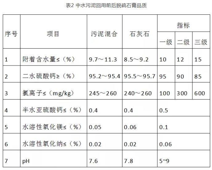 作为石灰石脱硫工艺的副产物,脱硫石膏具有重要的再利用价值,如用于建筑行业材料制造,这不仅减少了电厂固废产生量,而且补偿了电厂脱硫的成本。脱硫石膏必须满足一定指标要求才能作用建筑行业的重要材料使用。依据国家标准《GB/T 37785—2019》,烟气脱硫石膏的主要包括附着含水量、二水硫酸钙、氯离子等指标,本工艺处理后中水污泥混合石灰石浆液进入脱硫吸收塔100 h后产生的石膏与单纯的石灰石浆液在相同工况下得到的石膏品质如表2所示。