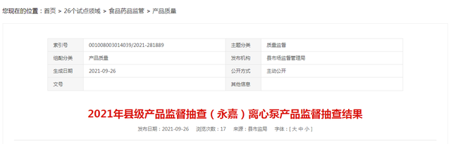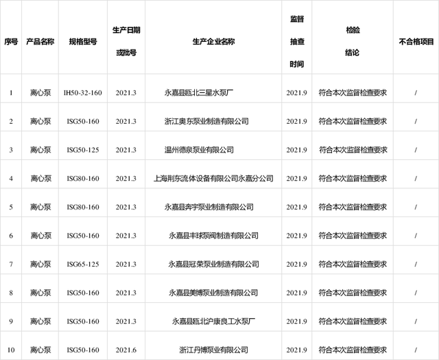 2021年县级产品监督抽查(永嘉)离心泵产品结果汇总表