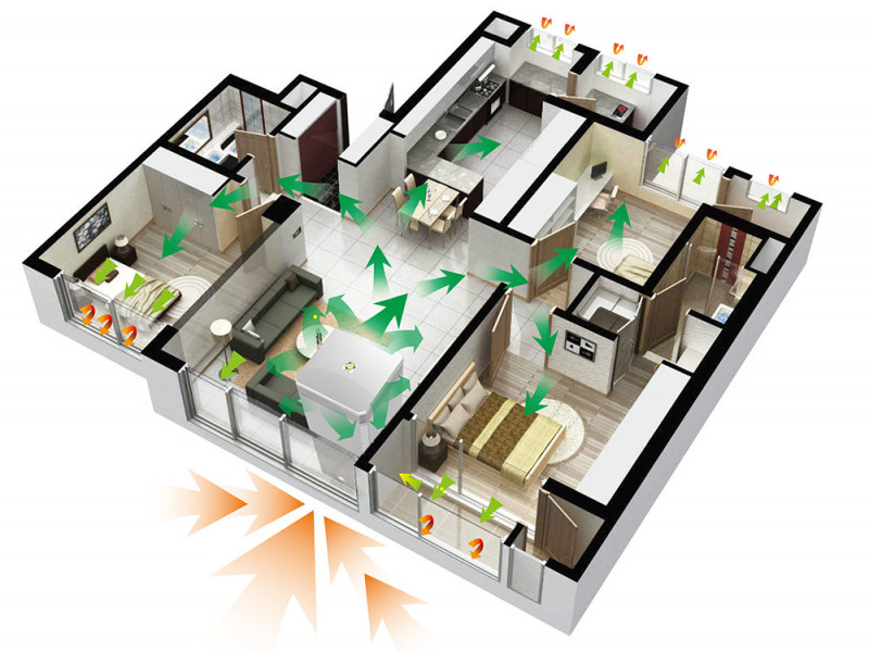 从目前已知要实现室内通风换气的方法主要有两种,自然通风和机械通风。自然通风是所有家庭最常用的方法,通过建筑物内外空气密度差造成的热压或室外大气运动造成的风压来促使空气自然流动;机械通风则是通过机械装置的运转所提供的风压驱使空气流动,正是现在普及的新风系统的原理。