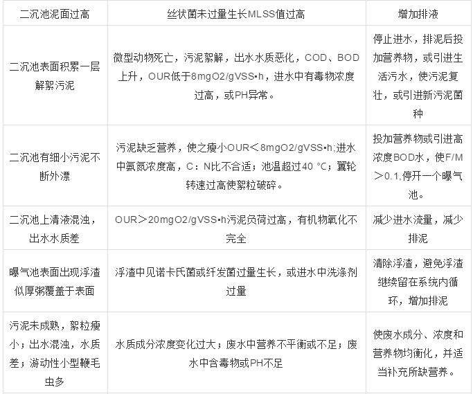 主要观察二沉池泥面高低、上清液透明程度,有无漂泥,漂泥粒大小等指标,并根据如下经验进行分析:
