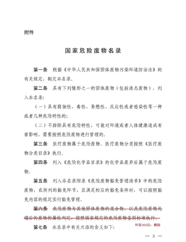 一是删除2016 年版《名录》正文第四条“列入《危险化学品目录》的化学品废弃后属于危险废物”;