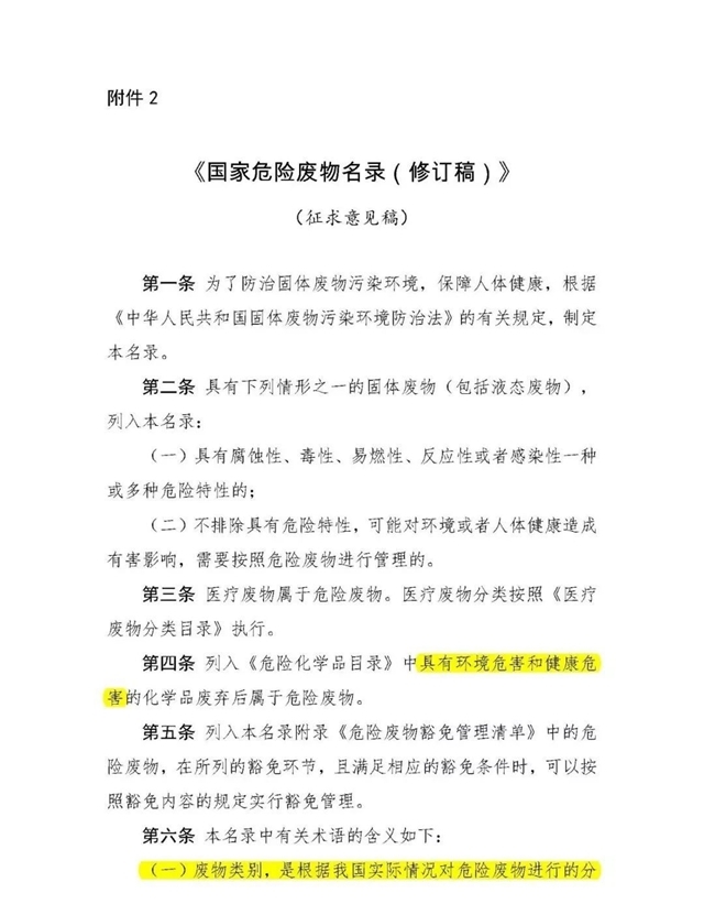 2019年9月5日,生态环境部发布关于征求《国家危险废物名录(修订稿)》(征求意见稿)意见的函;2019年12月30日,生态环境部发布关于公开征求《国家危险废物名录(修订稿)》(二次征求意见稿)意见的通知。