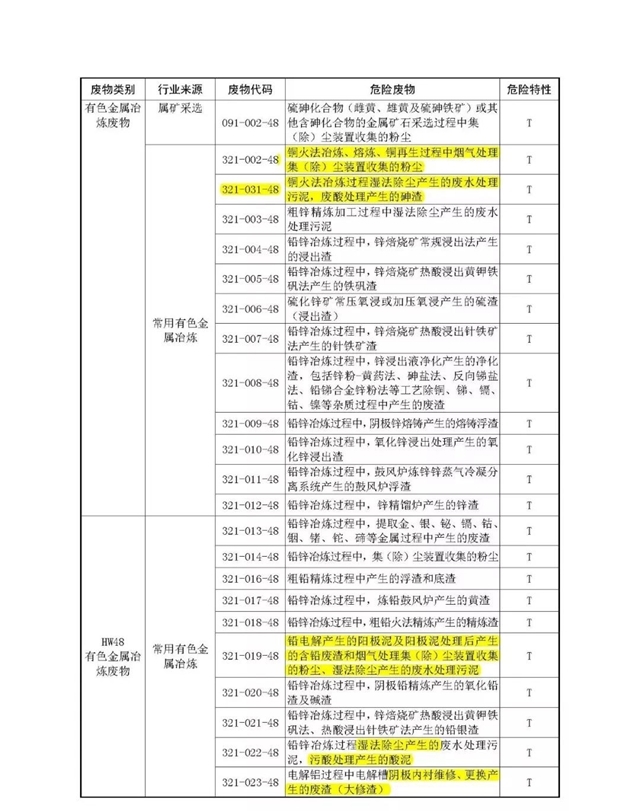 5.修改铜、铅、锌冶炼相关危险废物的规定。2016 年版《名录》对铜、铅、锌等有色金属冶炼过程产生的危险废物类型及工艺描述不清,本次修订过程中对该类废物开展了专项调查研究,重新梳理并细化了铜、铅、锌冶炼过程产生的危险废物种类及其工艺来源和危险特性。