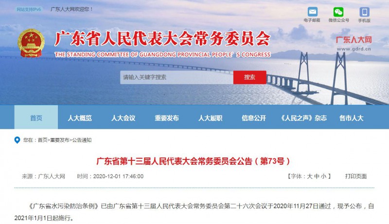 北极星水处理网获悉,《广东省水污染防治条例》已由广东省第十三届人民代表大会常务委员会第二十六次会议于2020年11月27日通过,自2021年1月1日起施行。