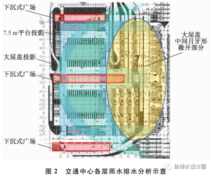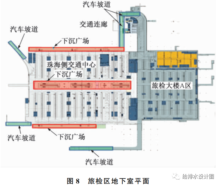 珠海口岸地处人工岛,受台风影响较大,特别是交通中心地下室区域(如图2所示),地下室上方为椭圆形拱型钢结构大屋盖,中间月牙形敞开部分下面为交通中心7.50m 室外平台、±0.00m 层地下室顶板。为了地下室采光通风以及消防需求,该区域设置了部分敞开下沉式广场,而交通中心地下室与旅检楼 A 地下室相连,设有停车库、后备仓库以及强弱电机.html'>电机房、泵.html'>消防泵房和冷冻机房等重要的设备机房,短期积水即能引起较严重的后果。因此,设计采用“高水高排,低水低排”的雨水排水策略,将大屋盖、7.50m 层的雨水和±0.00m 层雨水直接接入室外雨水系统,仅地下室层采用潜水泵加压提升后排至室外雨水系统,尽可能的减少雨水流入地下室、防止发生内涝。