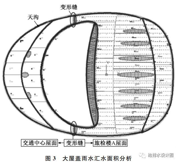 地下室上方为椭圆形拱型钢结构大屋盖,屋面面积巨大(约为93534 ㎡ ,如图3所示),地下室顶板作为室外巴士停车区,上无覆土,无法敷设雨水管道,雨水管道只能在地下室顶板梁下敷设横管,才能接到室外雨水窨井。如采用传统的重力流或半有压屋面雨水排水系统,需将雨水在屋面收集,沿立管引至地下室,在地下室顶板梁下敷设横管,接至室外雨水窨井。这样横管沿排水方向需要一定的坡度,而管道从起点到地下室外墙的距离较长,既大量占用建筑空间,又大大加深室外雨水管线的埋深。