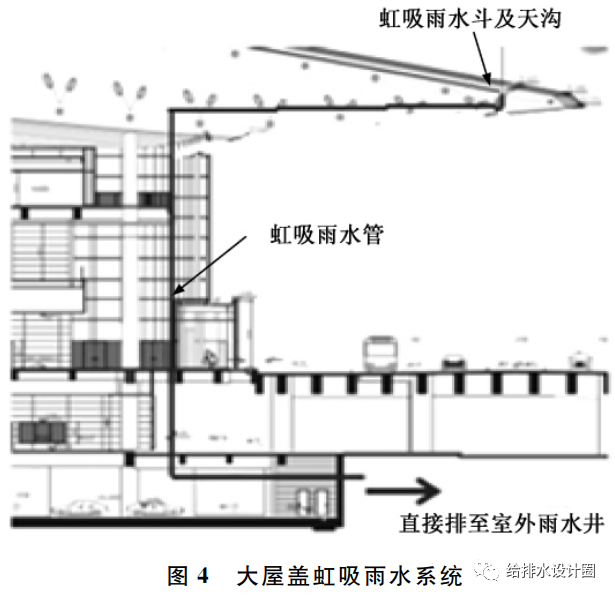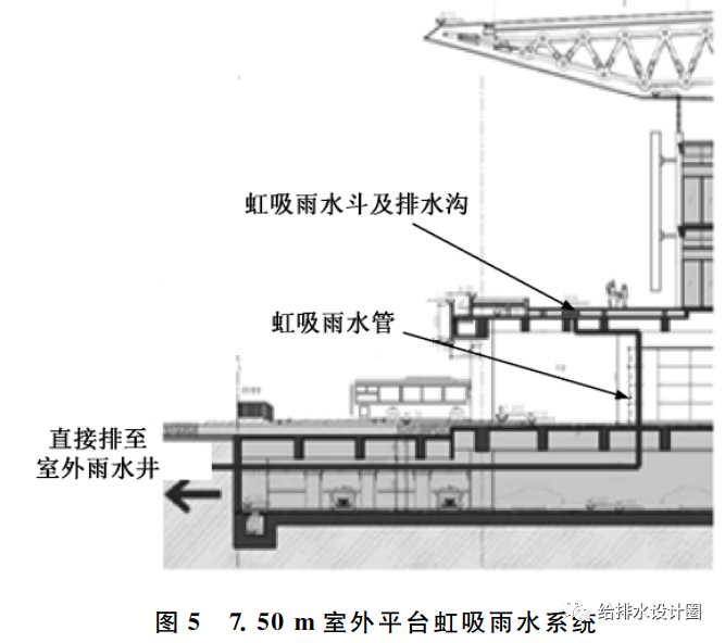 为 解 决 上 述 问题 , 大 屋 盖 和7.50 m 室外 平 台 采 用 虹 吸 雨 水系统 , 大 屋 面 设 置 雨 水 天 沟 及 虹 吸 雨 水 斗 , 雨 水 立 管 设在 钢 立 柱 凹 槽 内 , 在 0.0m /- 5.85m 地 下 室 高 位 悬 吊 管 直 接接 至 室外 雨 水 井 如 图 4 所 示 ; 7.5m 室外 平 台 设 置 雨 水 沟 及 虹 吸 雨 水 斗 , 雨 水 立 管 沿 立 柱 设 置 , 在 地 下 室 高 位 悬 吊 管 直 接接 至 室外 雨 水 井 , 如 图 5 所 示 。 压 力 流 屋 面 雨 水排水系统 相 对于 传 统的重 力 流或 半 有 压 屋 面 雨 水排水系统 , 其 最 大的 优 势 在于 雨 水 管 道 在 地 下 室 顶 板 梁 下 可 以 不 放 坡敷 设 横 管 , 横 管 从 起 点到地 下 室外 墙 的 距 离 较 长 , 也 不 影响 建 筑 层 高和 室外 雨 水 管 网 的 标 高 。 此 外 , 节 省 立 管 数 量 和 管 径 , 减少 连 接 各 立 管 埋 地 管 的 数 量 , 较能 符 合 建 筑 美 观 的 要 求 , 尤 其 在大 空 间 大 跨 度的建 筑 物 中 , 虹 吸系统 具 有 显著 的 运 用 价 值 。