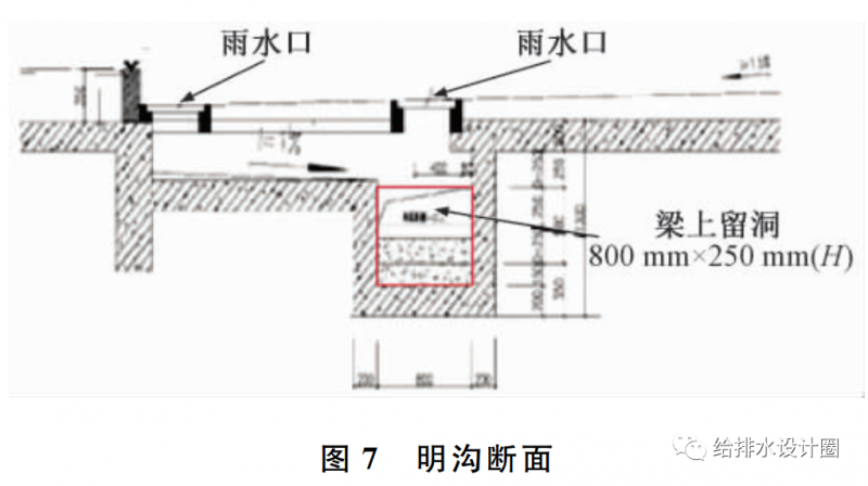 受结构限制,明沟设计采用2种形式:一种是设在地下室顶板上的明沟,位于跨中,在梁上按排水坡度要求的标高开800mm×250mm(H)的洞,并每9m设置1个雨水口,见图6和图7;另一种是设在下沉式广场上空的外挂式明沟,用于收集受地下室敞开区域阻断的明沟排水和场地排水,见图6。明沟最长的长度约95m,汇水面积最大的约为2000 ㎡ 。±0.00m层明沟收集的雨水,直接排入室外雨水系统。