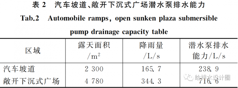 地下室的汽车坡道、下沉式广场等区域均设置雨水沟和集水坑,集水坑内设潜水泵,潜水泵的排水能力有较大的富余量(见图8和表2)。地下室另设置地面排水废水集水坑(64个)及潜水泵,总排水能力达到355.6L/s,确保地下室雨水由潜水泵提升排至室外雨水系统。此外,潜水泵设有不间断的动力供应,保障供电,避免内涝。