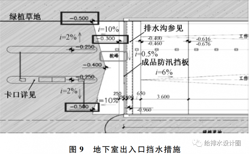 地下室雨水排水设计,除及时、有效的排除积水外,应首先考虑减少或避免倒灌形成积水。本工程考虑设置挡水设施,具体情况见图9。地下室出入口设驼峰,高200mm;挡水坎后设排水沟,排水沟排水直接接至室外雨水系统;挡水坎上方设防汛挡板,当道路积水严重时,防止道路积水进入地下室。