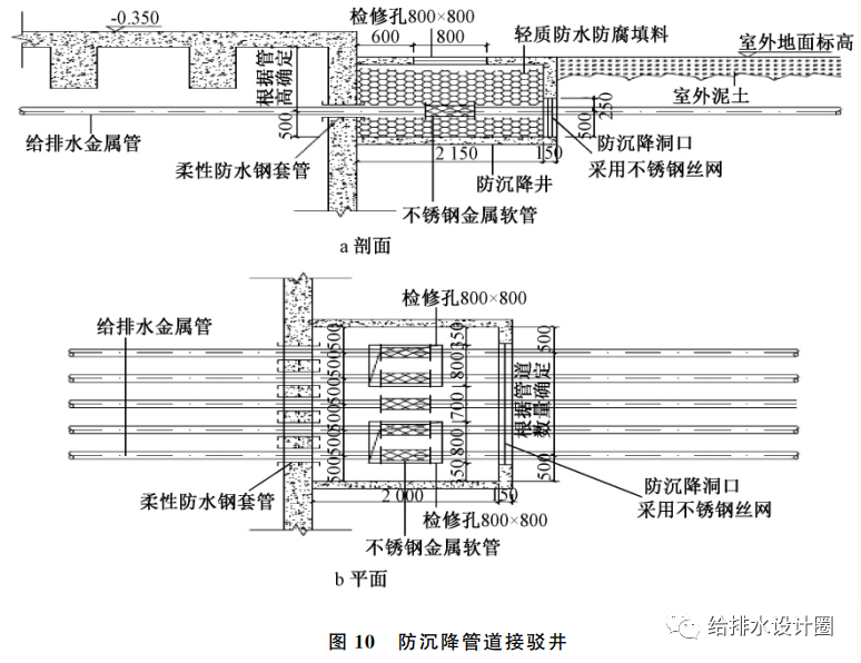 ①对于埋地压力排水出户管,本设计在地下室管道侧墙接口外侧,采取专门设计的防沉降管道接驳井(如图10所示),采用不锈钢丝网封口(不影响管道沉降),井中放置软性防水填料.html'>填料(防止井中积水增加结构荷载),埋地排水管出外墙后安装不锈钢金属软管;