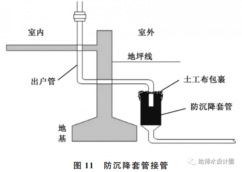 ② 对于 埋 地 重 力 排水 出 户 管 , 排水 管 出 户 后 就 设 一 个 弯 头 向 下 , 弯 头 下 有 一 段 考 虑 沉 降 长 度的 直 管 , 直 管 插 进一 个 特 殊 的 防 沉 降 套 管 配 件 ( 如 图 11 所 示 ), 插 入 直 管 可在 套 管 内 滑 动 , 为防 止 防 沉 降 套 管 接 口 缝 隙 处 渗漏 和 泥 沙 渗 入 , 防 沉 降 套 管 接 口 缝 隙 处 采 用土 工 布 包 裹 。
