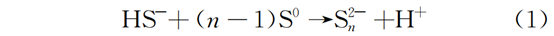 硫醚的前体物分别为以下两种:第一种是含硫有机物,包括半胱氨酸、甲硫氨酸和丙酸二甲酯等。其中含硫氨基酸普遍存在于动植物和微生物中,因此在水中比较常见。第二种是多硫化物(S2-n)。近几年,多硫化物作为硫循环中重要的中间体受到关注。大量研究认为其形成的过程为:在硫化物存在的情况下,单质硫与HS-反应形成多硫化物,反应方程式见式(1)。此外,有学者认为这类物质也可以通过微生物降解含硫有机物得到。关于多硫化物,其n值(即链长)一般认为是2~9。但是由于受到pH、温度、离子强度以及硫化物浓度的影响,在自然水体中n值一般是2~5,其中短链长(n=2,3)的多硫化物占据多数。