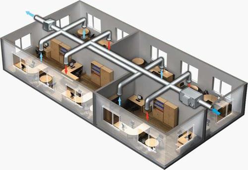 答:单向流的风机进入室内的只有一根主管道,需要在进入每个房间时做三通分支,主管道需要根据风量的变化做变径,自平衡的风机接出的是多根管道,每跟管道一般单独带一个风口。