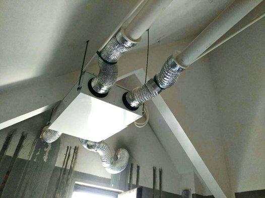 答:上出风新风和排风管道均为PVC管,并且全部隐藏在天花上,安装时应该尽量避免交叉、尽量减少排风管道的长度和软管的长度。