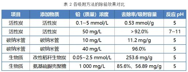 吸附除铅是通过投加吸附剂,利用分子间作用力或化学键达到去除废水中Pb2+的目的,主要有活性炭吸附、碳纳米管吸附和生物质吸附。
