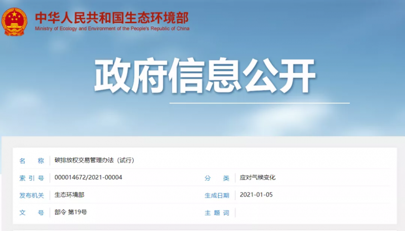 《碳排放权交易管理办法(试行)》已于2020年12月25日由生态环境部部务会议审议通过,现予公布,自2021年2月1日起施行。