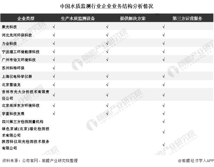 目前专门从事水质监测运营服务的第三方运营实体企业仍较少,市场上规模较大的水质监测运营服务企业既生产水质监测设备,同时提供解决方案、进行水质监测的运营服务,如聚光科技、河北先河环保科技、力合科技等,专门从事第三方运营的企业通产规模较小,市场更多集中在省市的范围内。