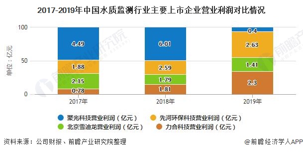 根据对水质监测行业国内企业营业收入分析,前瞻选择水质监测主要的上市企业进行了分析,分别为位于第二梯队的聚光科技、先河环保、北京雪迪龙和力合科技。2019年,国内靠前环境仪器制造企业聚光科技实现营业收入39.96亿元,营业利润0.4亿元;先河环保实现营业收入13.74亿元,营业利润2.67亿元;北京雪迪龙实现营业收入12.43亿元,营业利润1.41亿元。在四家分析的水质监测上市企业中,聚光科技高于其他三家企业,先河环保和北京雪迪龙紧随其后。