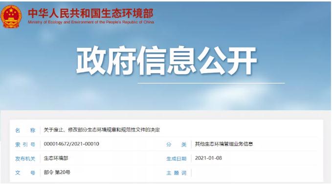 《关于废止、修改部分生态环境规章和规范性文件的决定》已于2020年12月25日由生态环境部部务会议审议通过,现予公布,自公布之日起施行。