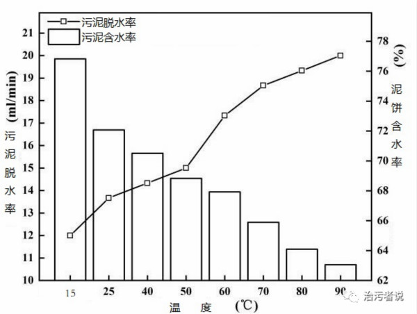 同样在一些研究中也表明,温度对污泥脱水率和脱水后的泥饼含水率的影响也比较大,从温度变化和污泥脱水率和泥饼含水率的变化曲线可以看到,污泥脱水率会随着温度的上升而变大,而泥饼的含水率会随着温度上升而变低。这也就说明在同样的生产工况条件下,温度对污泥脱水也会产生很大的影响。