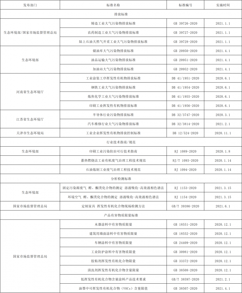在标准规范方面,国家和地方管理部门、行业协会陆续发布实施相关文件,确保VOCs减排任务的政策落地,具体见表1。
