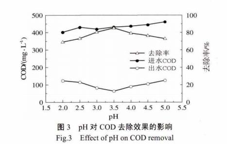 由图3可知,进水COD为400〜470mg/L,出水COD最低为64.77mg/L,能够满足芬顿系统设计出水要求。在pH为2〜5时,COD去除率随着pH的上升,表现出先明显上升、后明显降低的趋势,在pH为3.5时,对COD的去除效果为佳。
