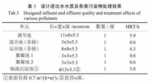 焦化厂尾水依靠重力、与H2SO4同步进入调节池,经充分混合后泵入芬顿混合池,先后与FeSO4、H2O2进行水力混合、随后进入反应池发生催化氧化反应,使得尾水中的COD得以大部分去除;芬顿出水再次进入絮凝池 1、经加碱pH调节后,与同步加入的PAM进行均匀混合,之后在絮凝池2内进一步进行水力搅拌与活化处理、形成矾花,最给于辐流沉淀池内发生沉淀反应、对尾水中难降解有机物进一步去除。出水进入复用水池以供重复利用。所涉及主要污水处理构筑物及相关设计参数见表3。
