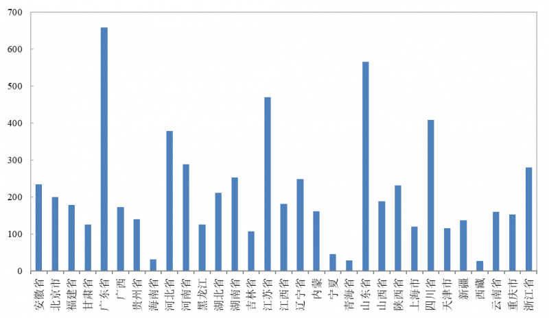 从登记数量来看,在广东省和山东省注册的环评编制单位超过500家,江苏省和四川省超过400家,河北省超过300家,其余大部分省份注册环评编制单位在100——300家,海南、青海、宁夏、西藏不超过50家,详见图1。