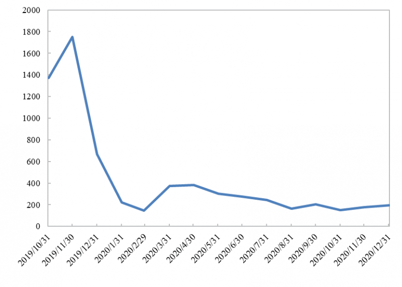 环评信用平台2019年11月启用以来,最初的几个月登记注册的环评编制单位数量较多,从2020年1月以后,每个月新登记的数量逐步平稳,基本稳定在200家左右,详见图2。