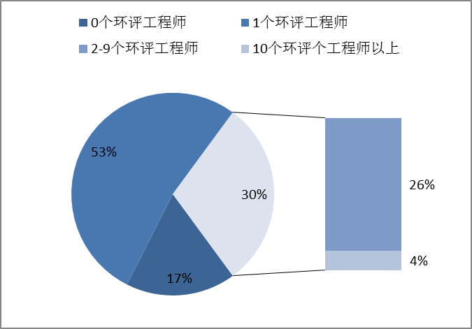 在6626家环评编制单位中,1162个环评编制单位有0个环评工程师、占比17.5%,3486个环评编制单位有1个环评工程师、占比52.6%,合计超过70%,仅有250家环评编制单位有10个以上环评工程师,仅占4%,详见图3。
