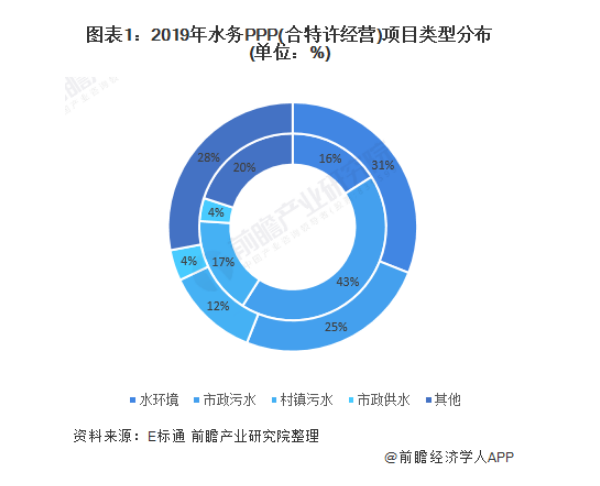 2019年,水务PPP(合特许经营)中标项目数量超过400个,投资额近3000亿。从项目数量分布上看,市政污水处理特许经营占主要部分,占比43%;从项目金额分布上看,水环境PPP占比最大,占比31%。