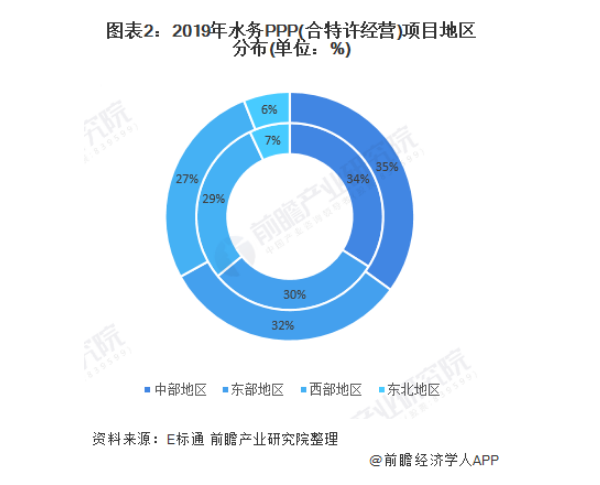 从2019年水务市场在不同地区的分布来看,中部地区项目数量和项目投资额占比均为第一,占比分别为34%和35%;其次为东部地区,项目数量和投资额占比分别为30%和32%。